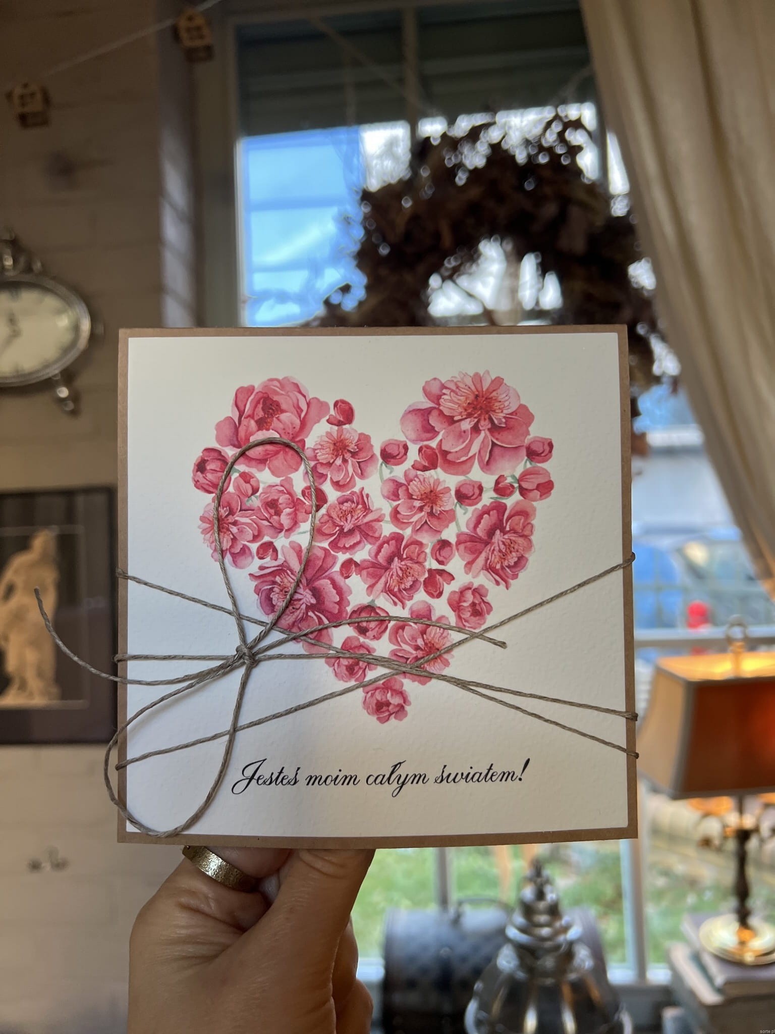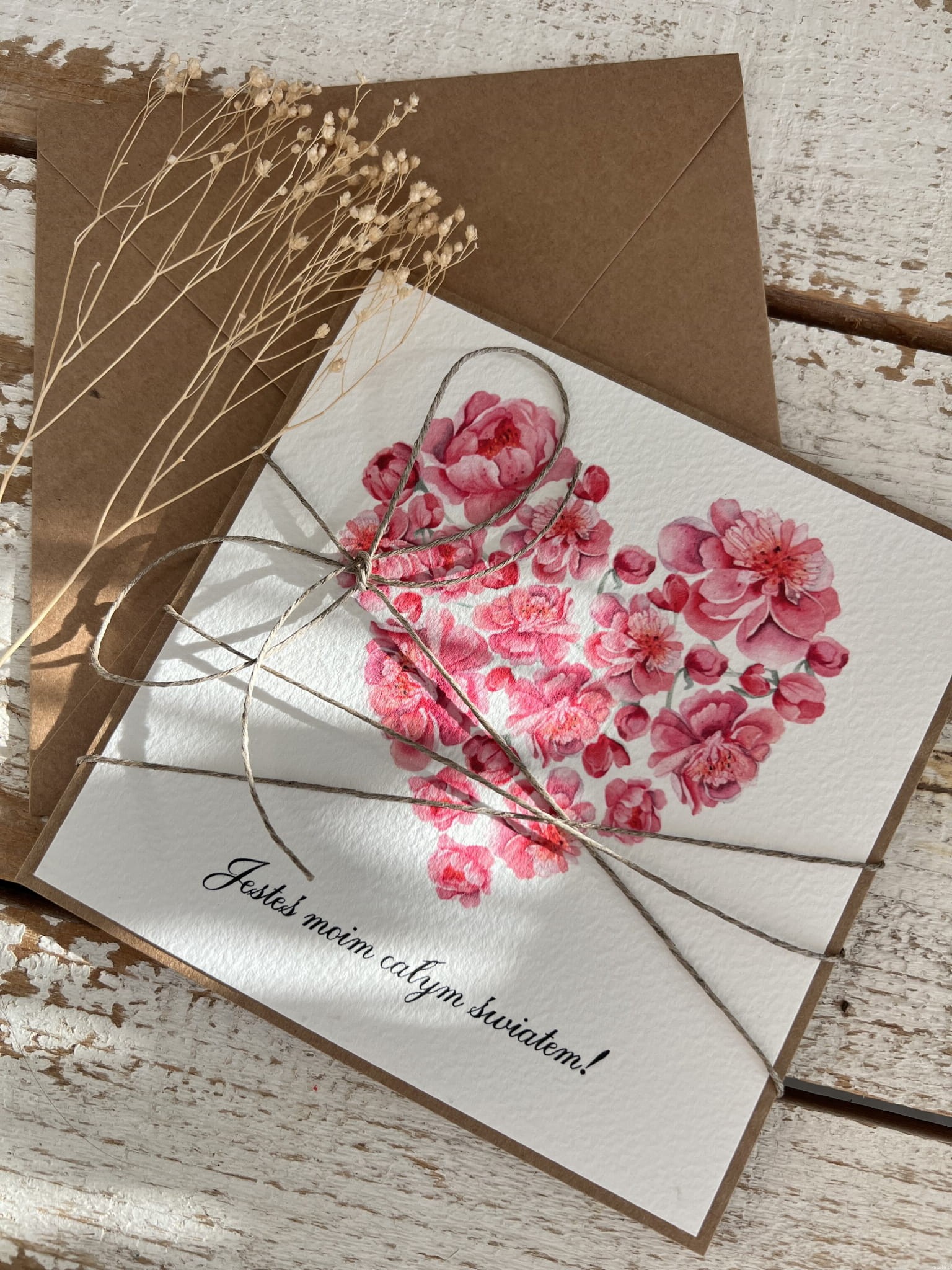 Wymiar kartki 14x14 cm w zestawie z brązową kopertą. Kartka przewiązana lnianym sznureczkiem.