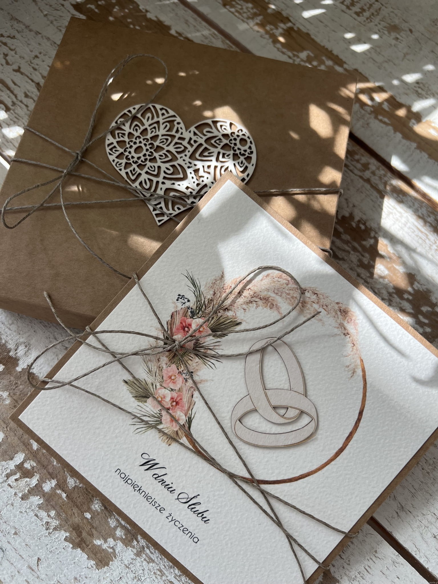 Kartka ślubna wykonana jest na bazie papieru kraftowego z użyciem starannie wyselekcjonowanego papieru bawełnianego w kolorze brzoskwini oraz ozdoby tekturkowej. Kartka przewiązana jest lnianym sznureczkiem.