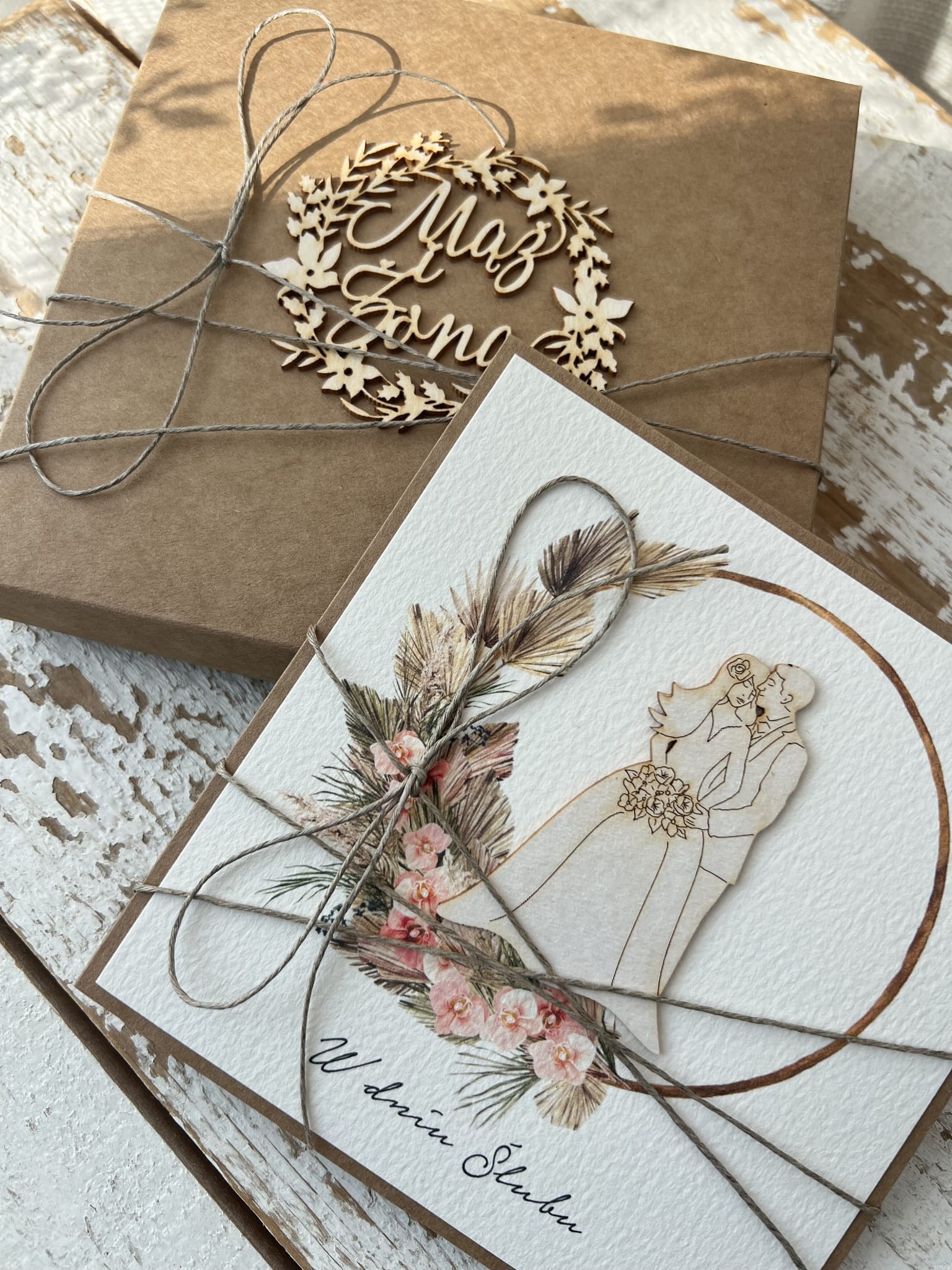 Kartka ślubna wykonana jest na bazie papieru kraftowego z użyciem starannie wyselekcjonowanego papieru bawełnianego w kolorze brzoskwini oraz ozdoby tekturkowej. Kartka przewiązana jest lnianym sznureczkiem.