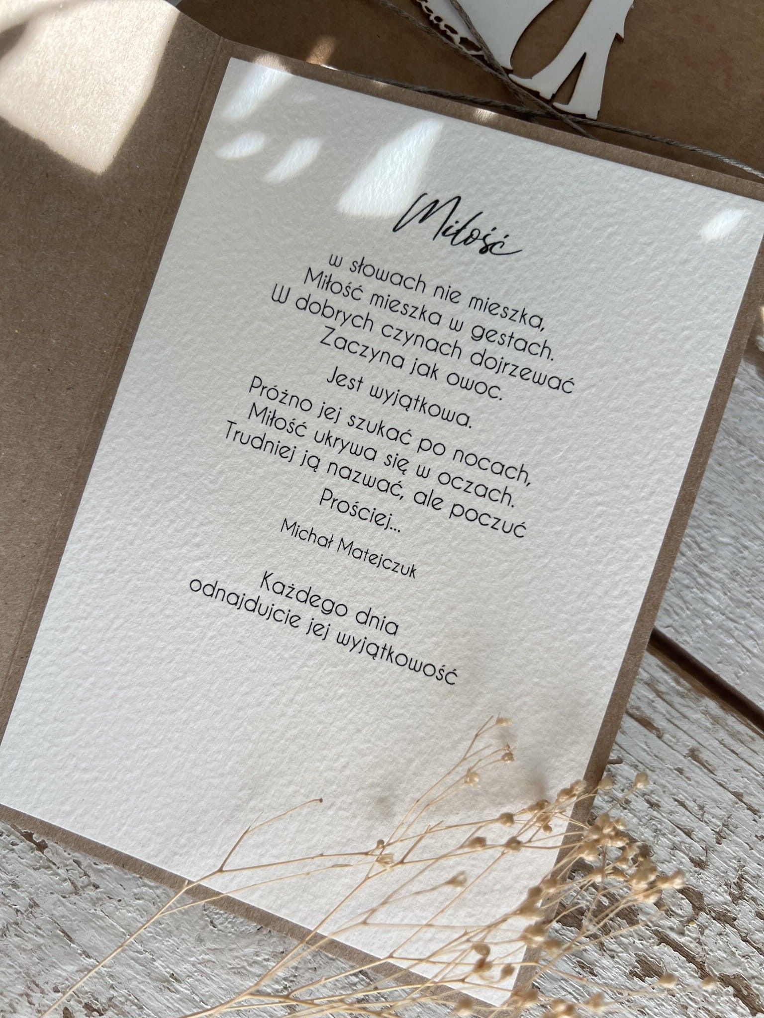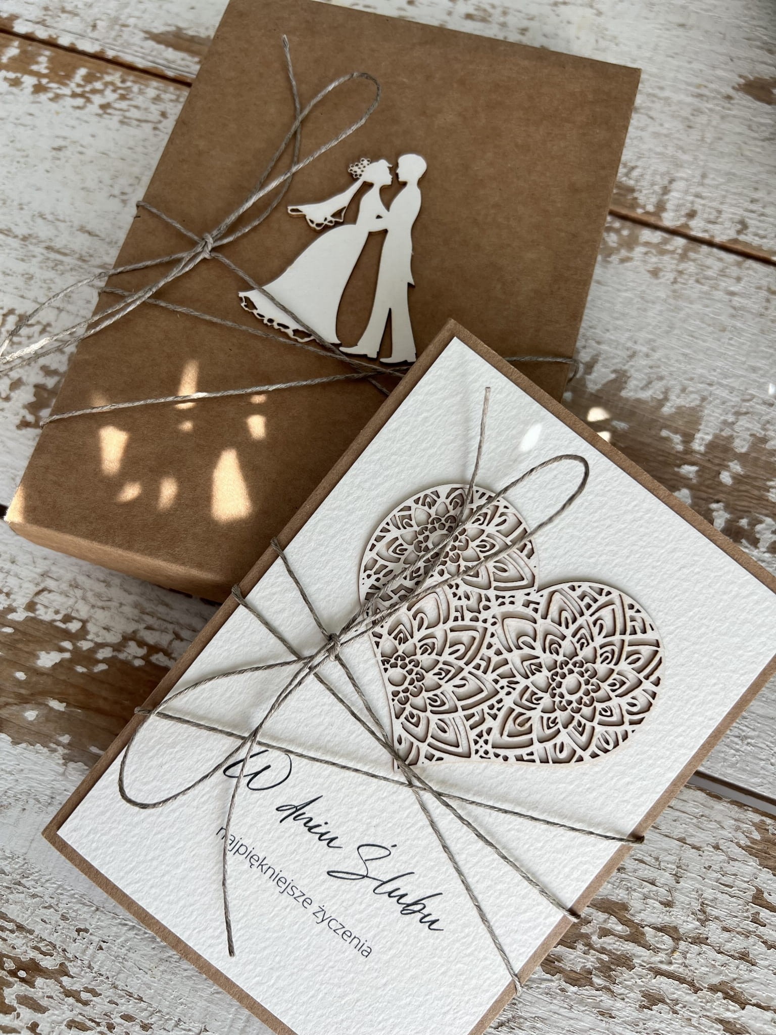 Kartka ślubna wykonana jest na bazie papieru kraftowego z użyciem starannie wyselekcjonowanego papieru bawełnianego oraz ozdoby tekturkowej. Kartka przewiązana jest lnianym sznureczkiem.