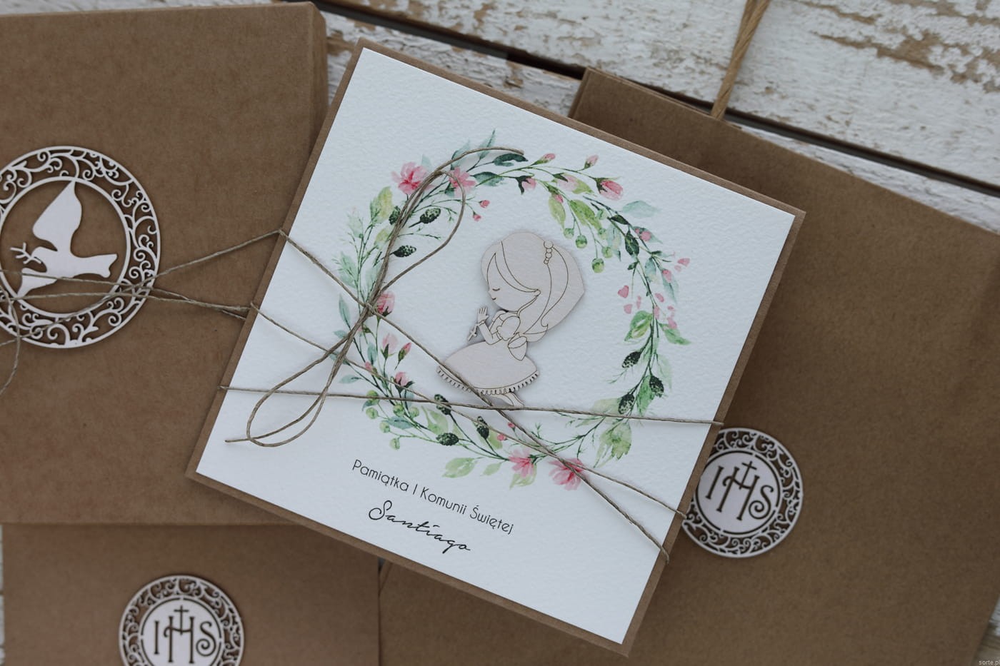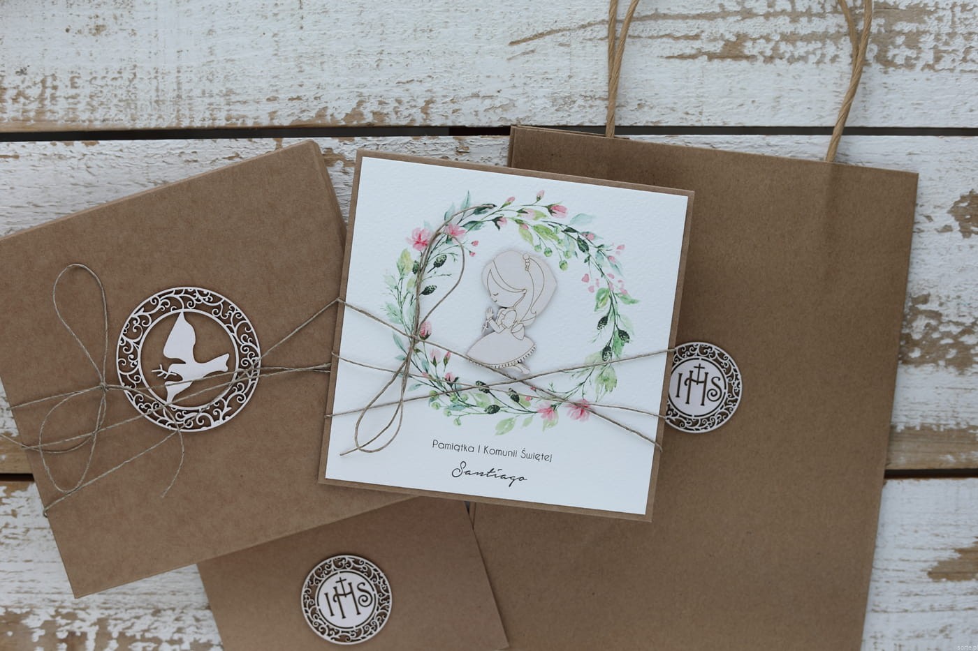 Rustykalna kartka na komunię handmade wykonana na bazie papieru kraftowego z użyciem starannie wyselekcjonowanego papieru bawełnianego w kolorze ecri oraz tekturkowej dziewczynki. Kartka otwierana jest do góry. Zestaw przewiązany jest lnianym sznureczkiem.