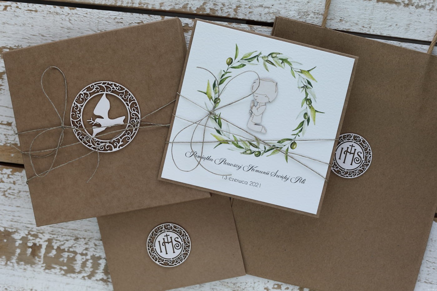 Ręcznie robiona kartka komunijna dla chłopca - wianek zielony