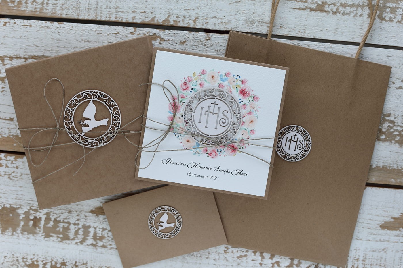 Rustykalna kartka na komunię handmade wykonana na bazie papieru kraftowego z użyciem starannie wyselekcjonowanego papieru bawełnianego w kolorze ecri oraz tekturkowej ozdoby. Kartka otwierana jest do góry. Zestaw przewiązany jest lnianym sznureczkiem.